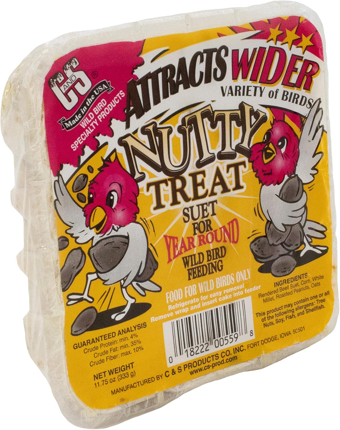 Nutty Treat is produced by melting the highest quality beef fat; blending it with a variety of seeds and nuts then pouring it into our trays to harden. C&S's quality and special processes allow suet to be fed year round resulting in summer suet feeding success by our consumers.Suet Treats are produced by blending the highest quality ingredients available. Consisting of melted fat, a variety of seeds, nuts and fruit, which are then poured into the tray and allowed to harden. Treats will become soft and pliable at 100 degrees (F) if exposed to extreme heat during shipping and storage. They will return to normal hardness again at room temperature.